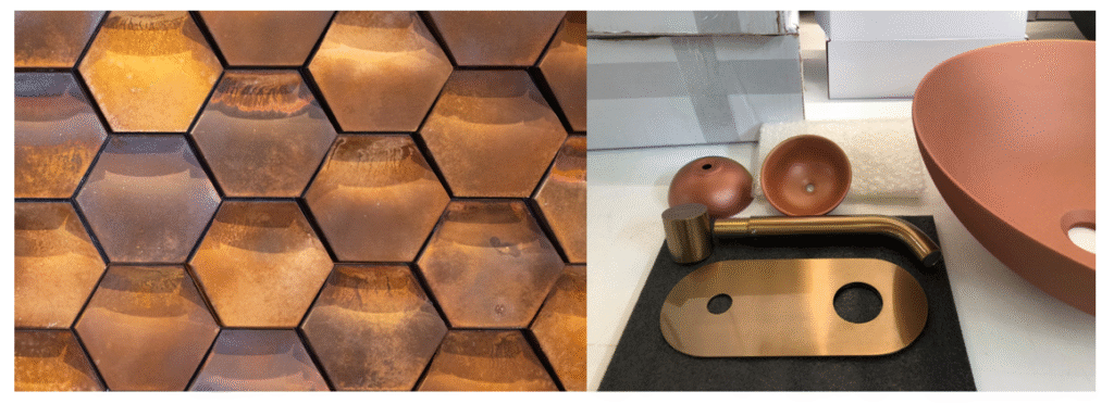 La interiorista Marta Sánchez Zornoza tenía claro que quería una pieza especial para la sala de catas así que envió unos azulejos hexagonales en tonos cobrizos como inspiración a los artistas de Bathco Atelier. Tras varias pruebas de color sobre diferentes modelos, se decantaron por un lavabo en tonos cobrizos pintado por los artistas junto a la válvula. Completa el conjunto con el grifo Milos Ref. 18093 (novedad Bathco 2022) de la que os hablaremos próximamente.