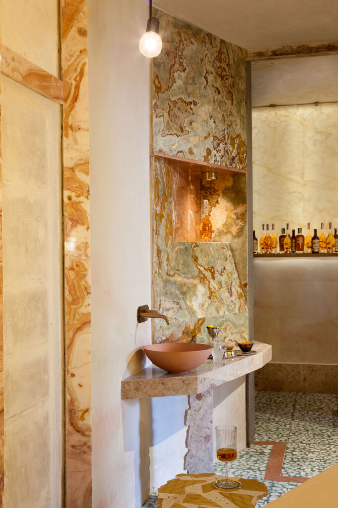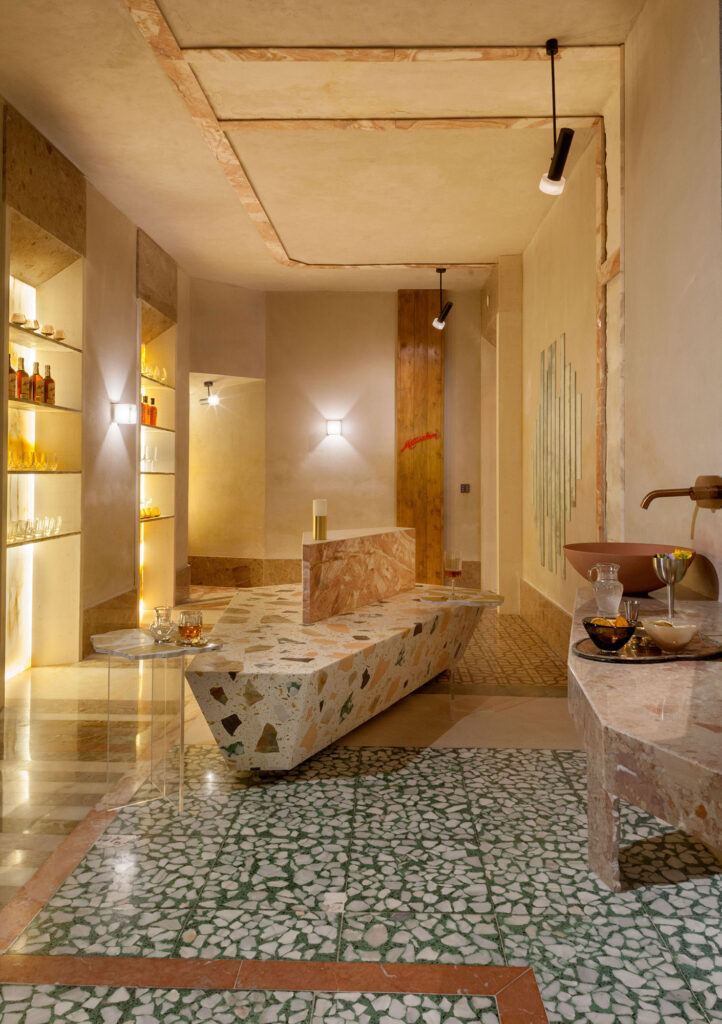 La piedra aligerada, la iluminación para sumar calidez y la rehabilitación de materiales. La piedra, elemento principal del proyecto, representa lo atemporal y sofisticado, y se ha elegido en tonos tostados, verdes y blancos que evocan al licor, al mar y a la luz. El terrazo y el hidráulico originales del edificio simbolizan la decadencia lujosa propia de los palacios cubanos. Todo, acompañado de escenas domóticas.