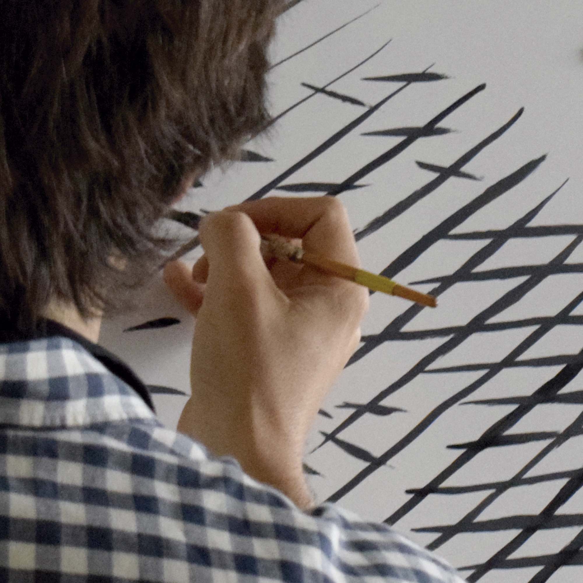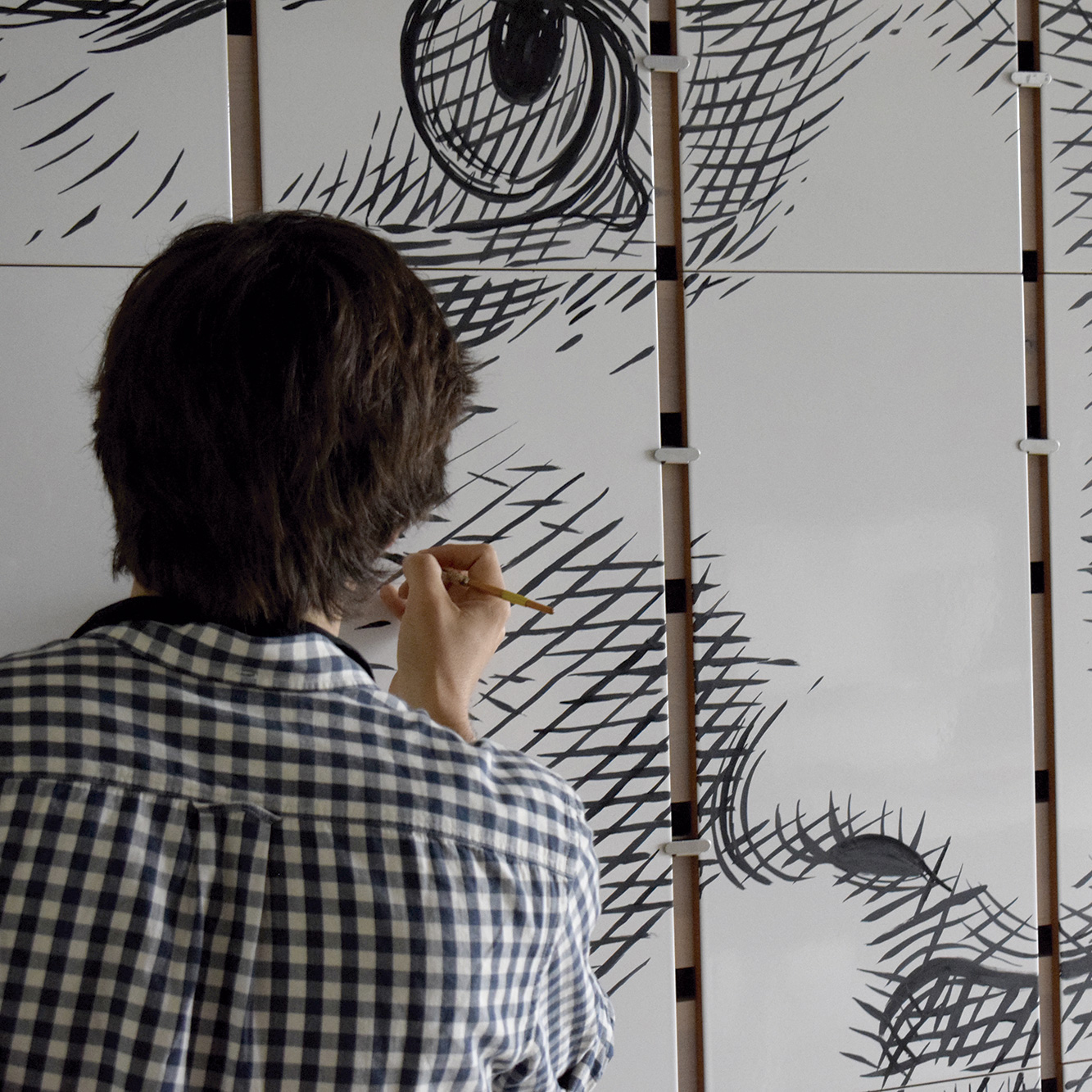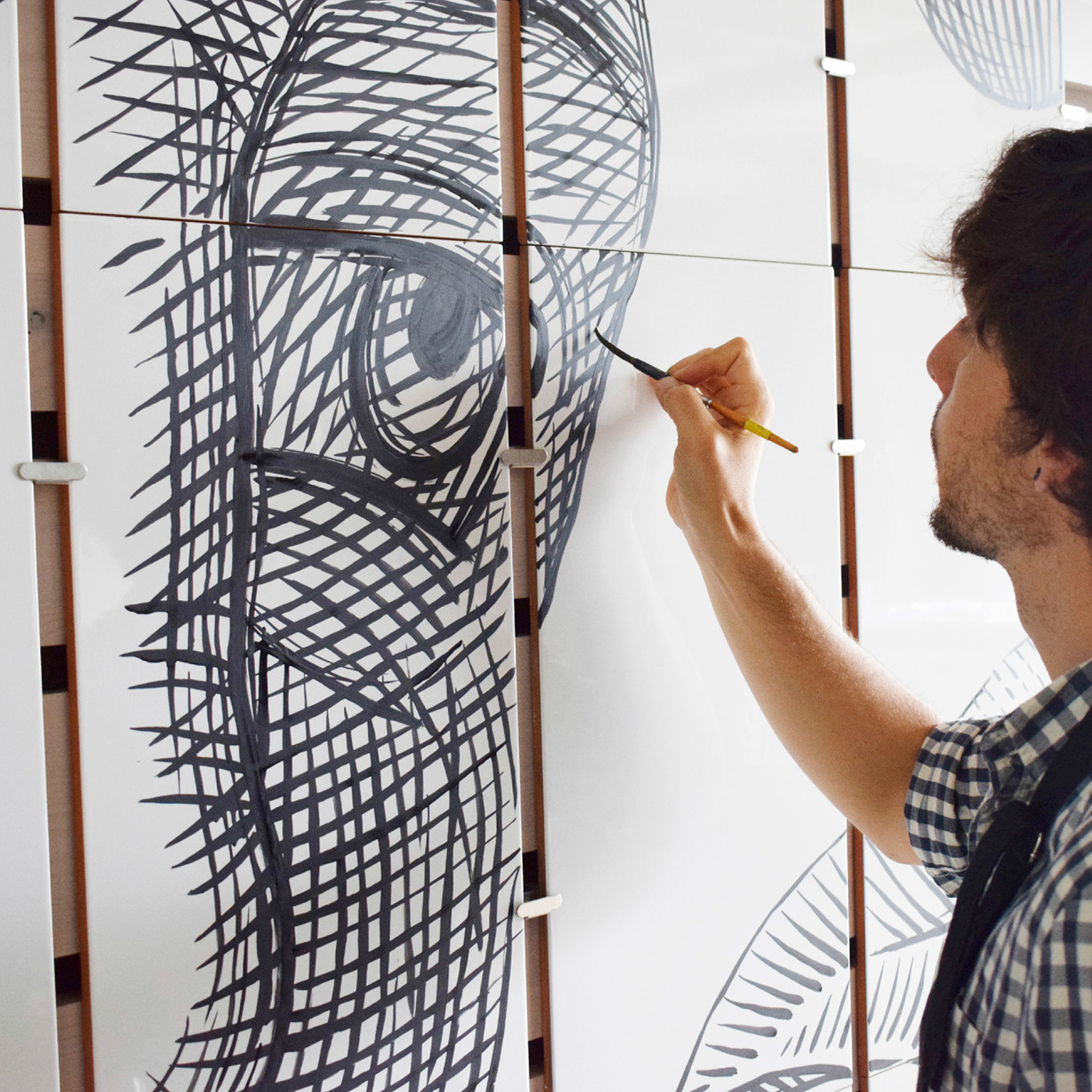 El mural diseñado para este espacio, aboga por un clasicismo renovado. El artista representa un rostro aludiendo a los antiguos grabados. El dibujo a base de líneas simulando lasincisiones del aguafuerte, inunda de clasicismo y academicismo la atmósfera sencilla y relajante. La técnica empleada en la creación de esta pieza es la pintura cerámicatradicional; un solo color y los pinceles de pelo de buey han sido las únicas herramientas empleadas por el artista.