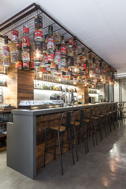Para ello, se proyectó un espacio donde se refleja claramente que la conserva o la lata que la contiene, pasa a ser la protagonista. Latas y jamones cobran vida, encerrándolos en jaulas, que presiden las dos grandes barras, cada una especializada en un plato estrella. En el espacio conviven materiales toscos y rudos como el micro-cemento y las mallas electro-soldadas, con materiales nobles y cálidos como la madera de roble. El binomio es constante incluso en el baño donde conviven las rejas metálicas y la porcelana del lavabo Gomera perteneciente a la colección mini de Bathco, una pieza perfecta para espacios reducidos.