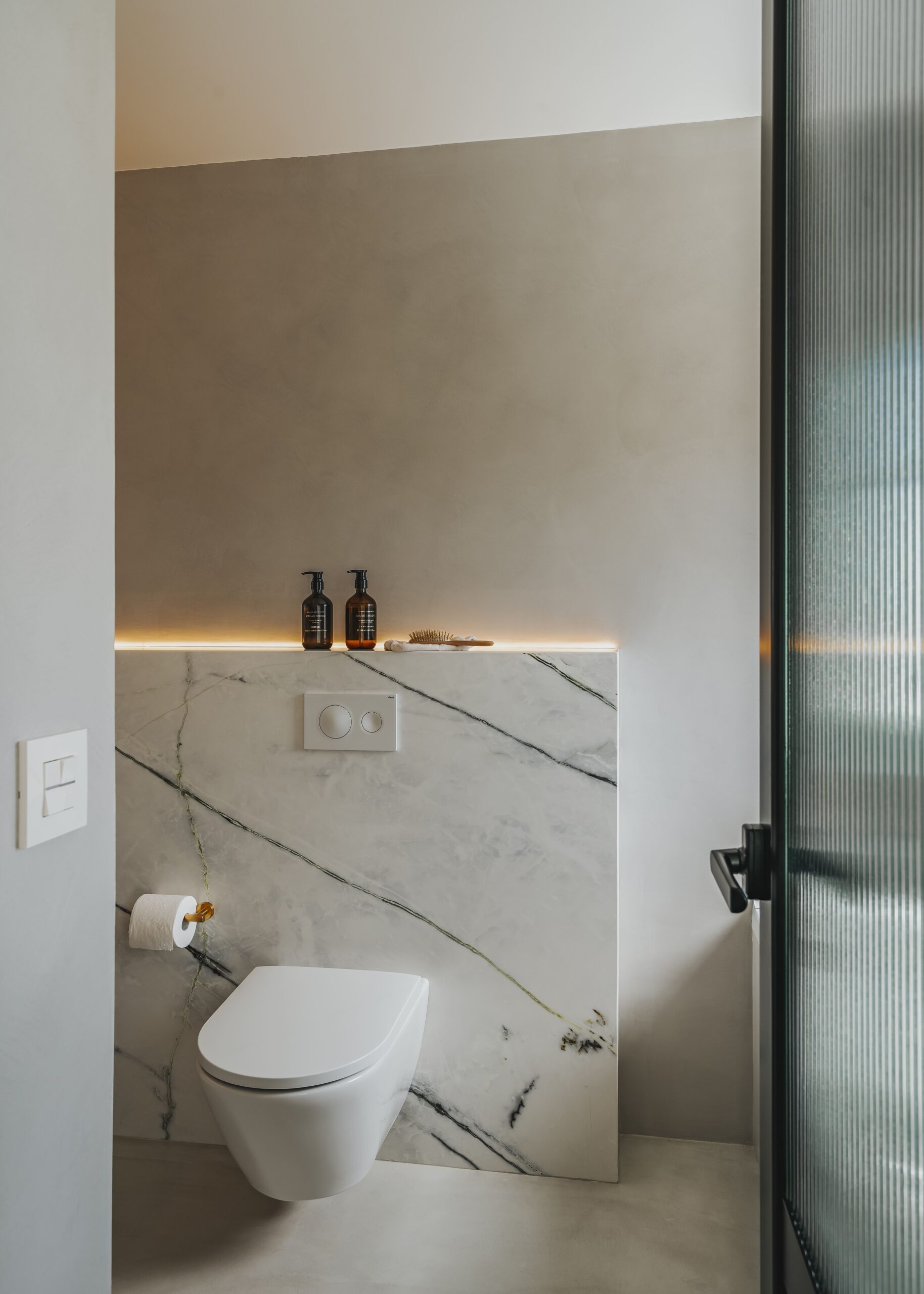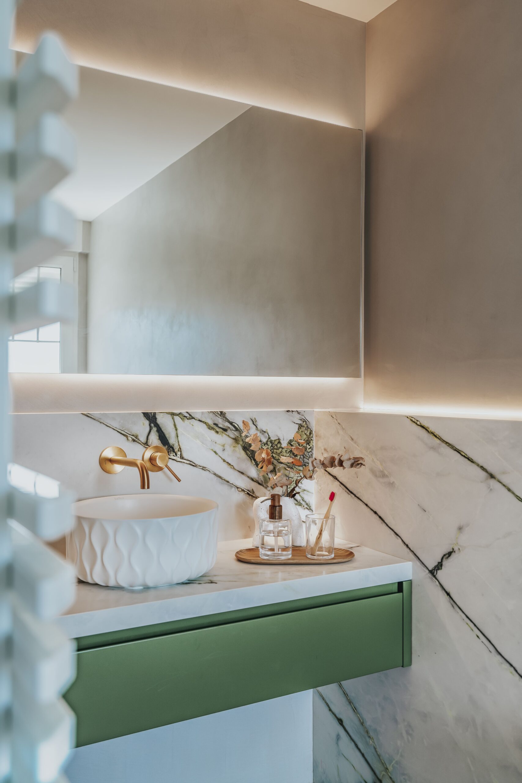El baño introduce frescura y carácter con sus vetas verdes, contrastando elegantemente con los tonos neutros del dormitorio. Este material, además de su belleza natural, es duradero y fácil de mantener.
