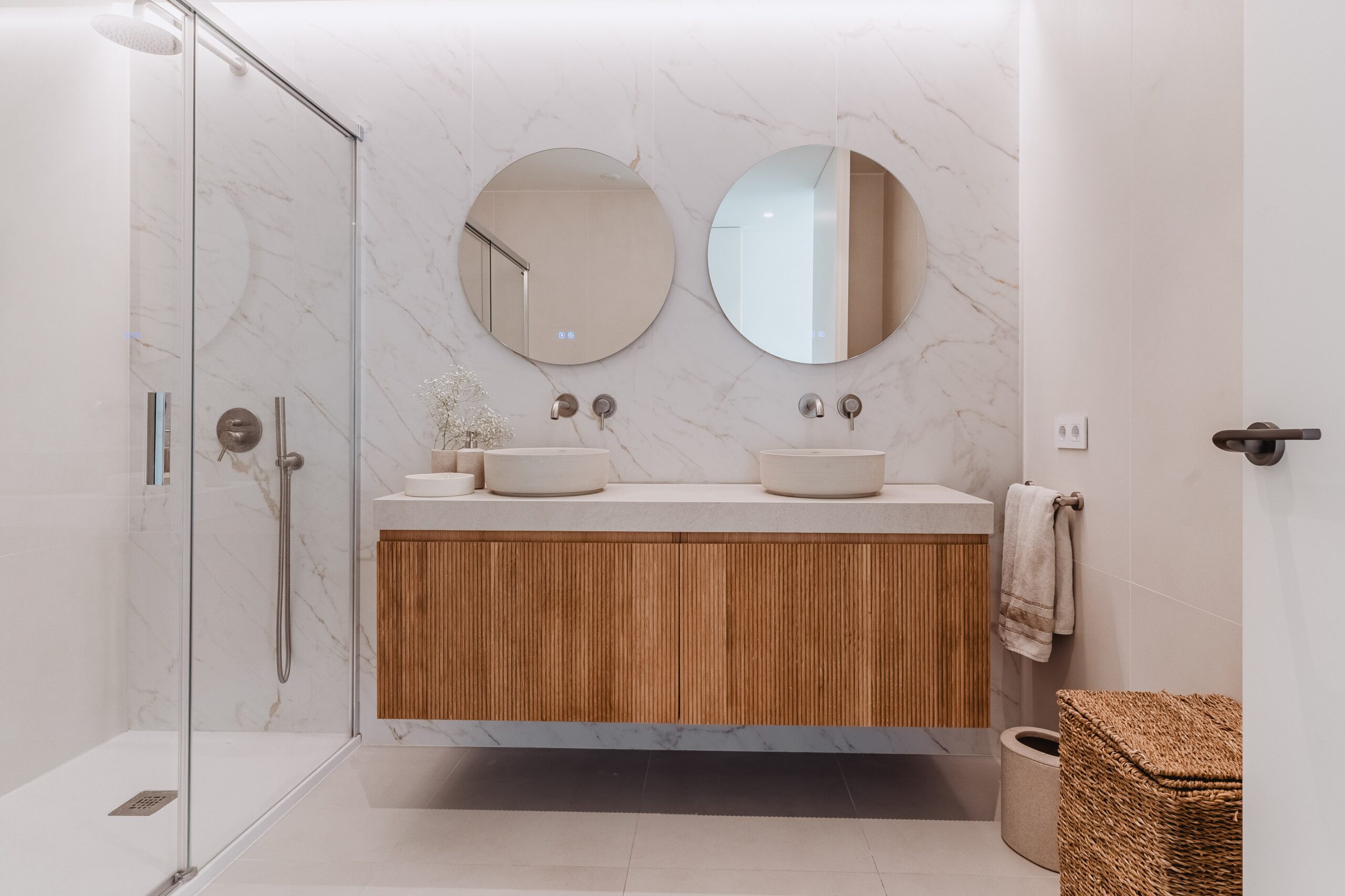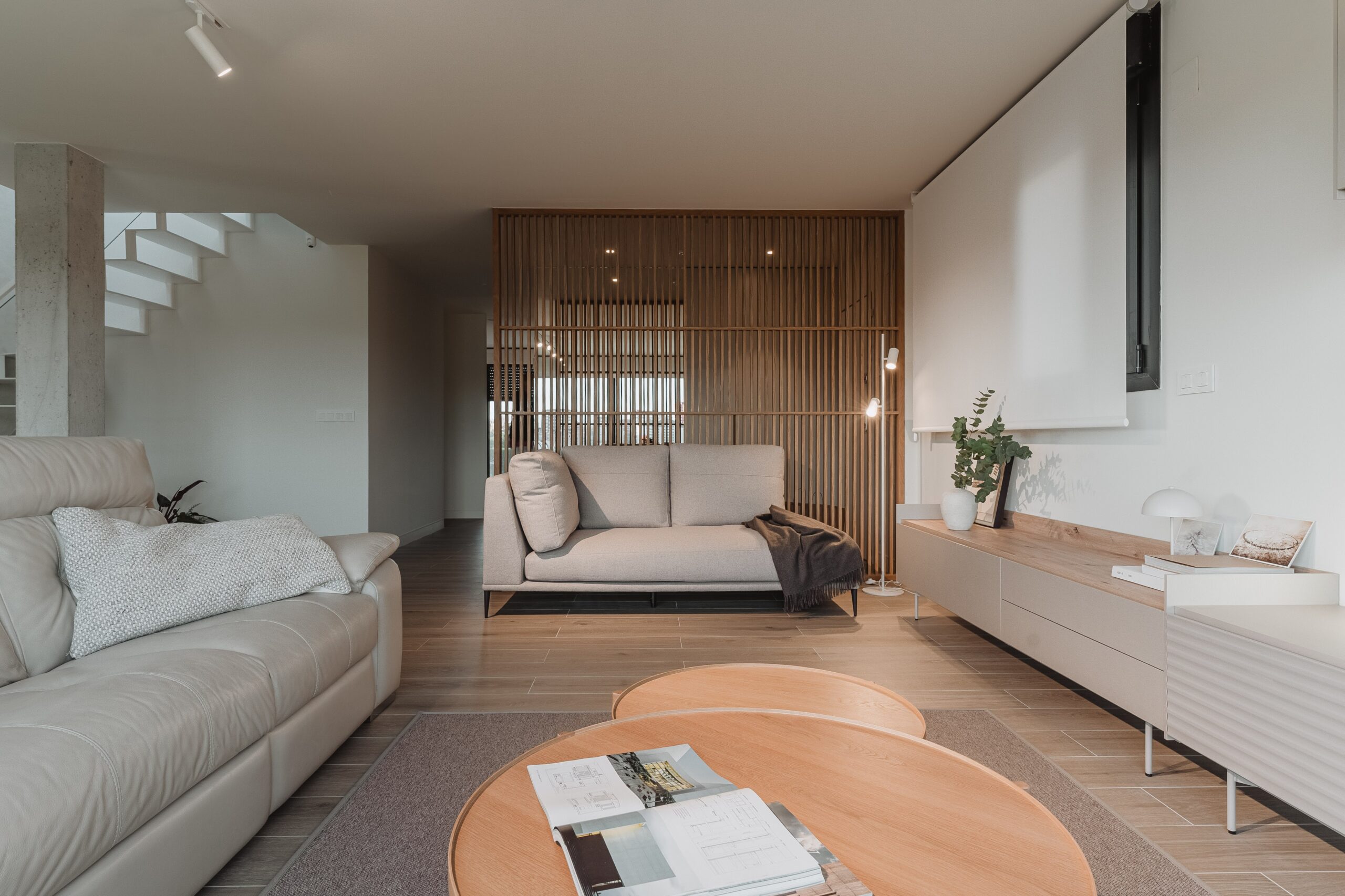 Los propietarios buscaban un equilibrio entre funcionalidad y una estética moderna. Al acceder a la vivienda, un vestíbulo cuidadosamente diseñado nos recibe con una imponente celosía de madera de roble maciza. Junto a un gran espejo empotrado genera un potente impacto visual desde el primer momento.