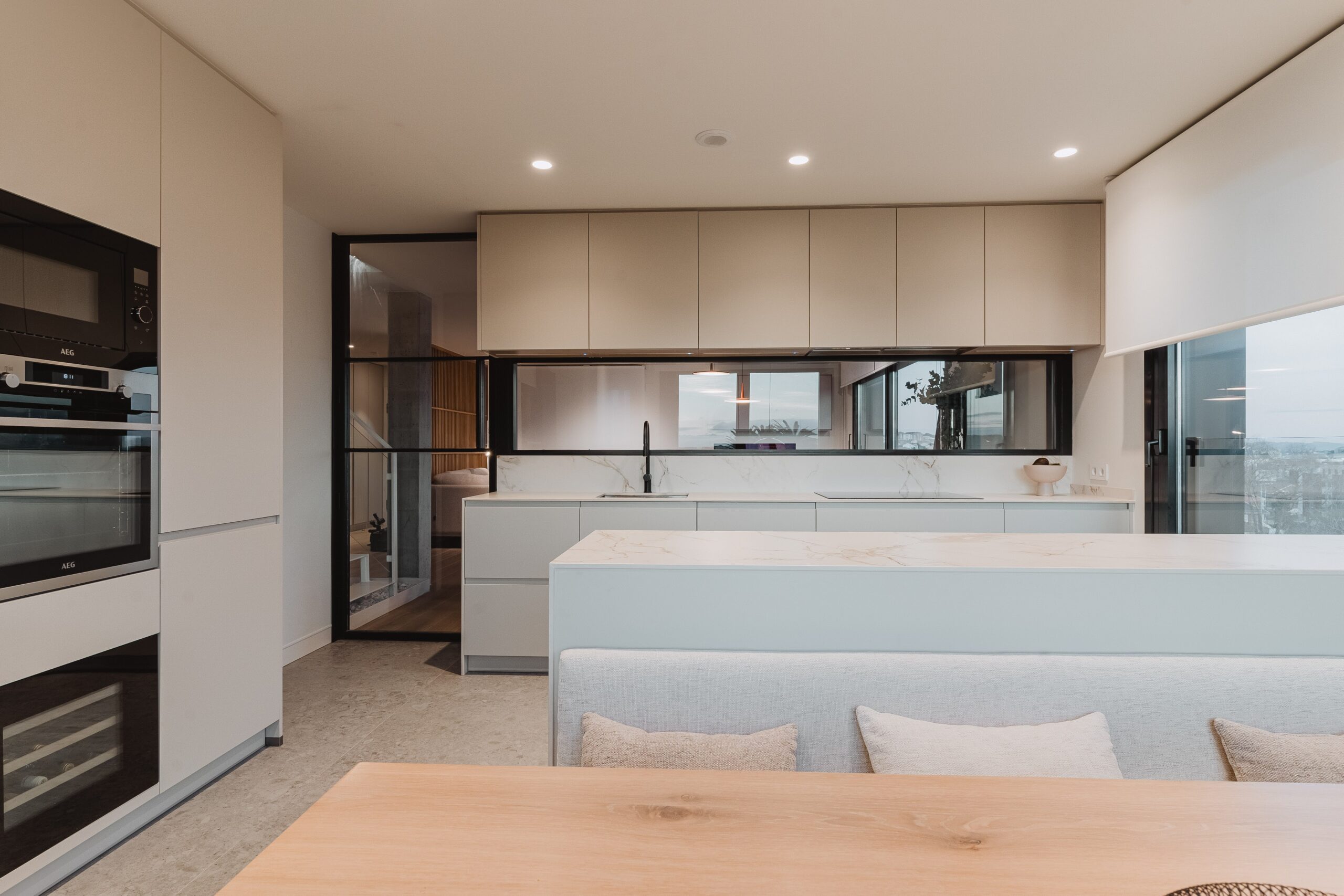 El espacio de día se organiza con una separación sutil entre el comedor y la cocina, lograda mediante un gran ventanal horizontal y una puerta de vidrio de suelo a techo. Esta solución reproduce en el interior la imagen de los grandes ventanales del edificio, permitiendo una visión fluida entre ambos espacios. La cocina, lejos de ser un área secundaria, se convierte en un punto de encuentro social, integrando un comedor de diario con mobiliario a medida.