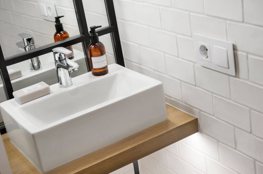 En la zona interior de la planta, el dormitorio secundario y su baño se han distribuido de forma ‘más convencional’. El lavabo Gerona sobre encimera de porcelana mini es de Bathco y como en el resto de los espacios, los mecanismos de Simon.