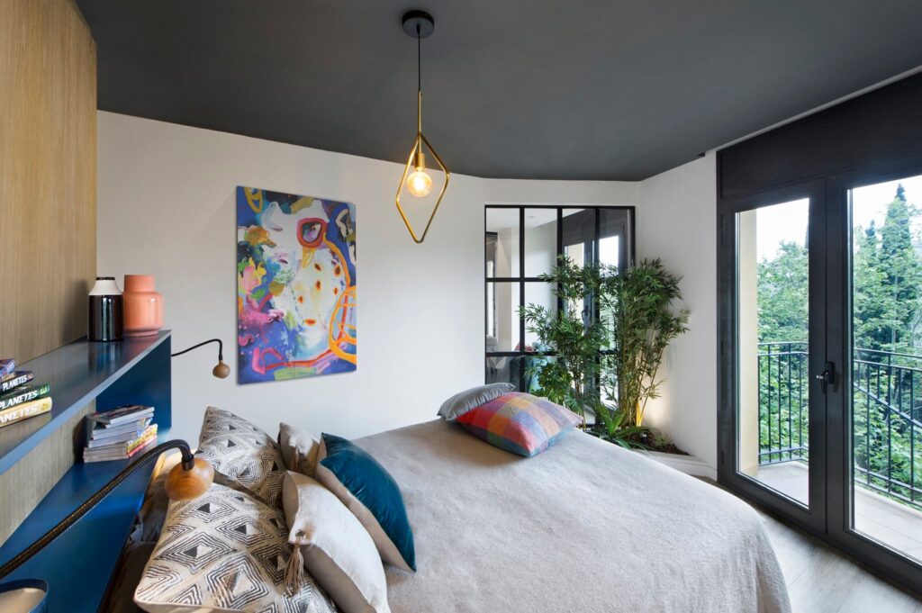 Tras el escritorio, y con acceso a través de una puerta corredera, se sitúa el dormitorio principal. Con una distribución abierta en referencia al antiguo loft, el vestidor separa la cama del cuarto de baño. Las lámparas de pared del cabecero de la cama son las nº8 de Marset. Un parterre vegetal con un ventanal de cuarterones comunica visualmente esta estancia con el espacio diáfano de las zonas comunes.