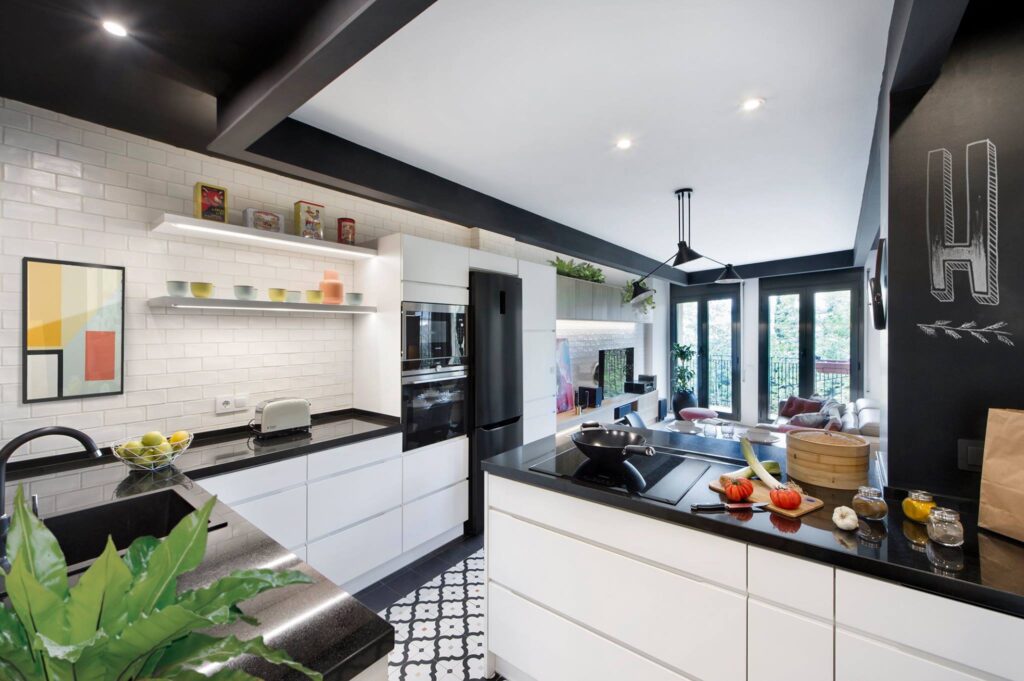 En la cocina, un manto de gres porcelánico imitación hidraúlico, de Vives, rompe la continuidad del pavimento de lamas de vinilo efecto madera de Glerflor que reviste el resto del espacio. En los paramentos verticales se ha combinado la pintura blanca con los azulejos tipo metro antiguo.