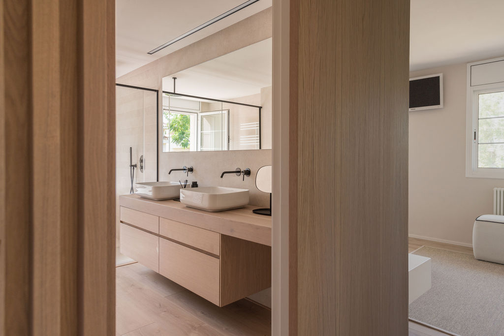 El mobiliario, diseñado a medida por el estudio de diseño de interiores para este proyecto, y adaptado a las necesidades de los habitantes, destaca por el uso predominante de la madera de roble, aportando un toque nórdico que apela especialmente a los propietarios.