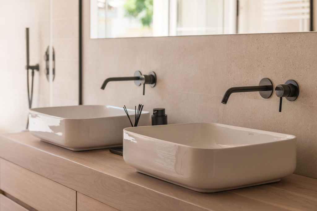 La paleta de colores neutros, en compañía de los detalles en madera del baño, evoca una sensación de serenidad, acentuada por la presencia elegante de accesorios en negro. El tocador con doble lavabo Dinan se convierte en una opción ideal para baños compartidos, infundiendo un toque de lujo y contemporaneidad en la estancia.