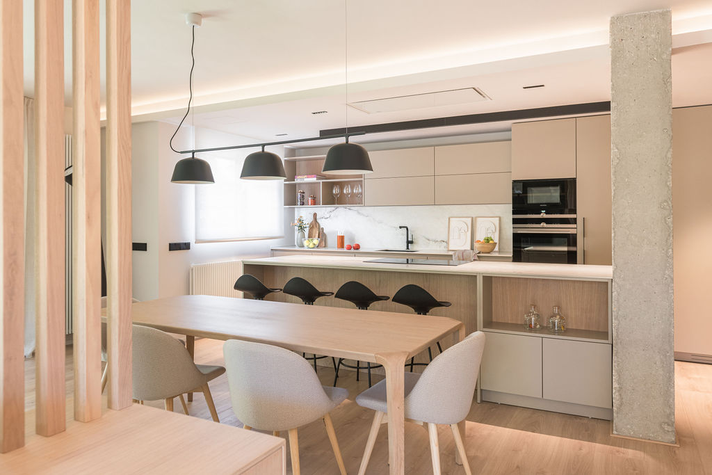 En la cocina, se diseñó una isla en torno a uno de los pilares de hormigón visto, creando un impactante contraste con el estilo nórdico logrado a través de la elegante combinación de materiales.