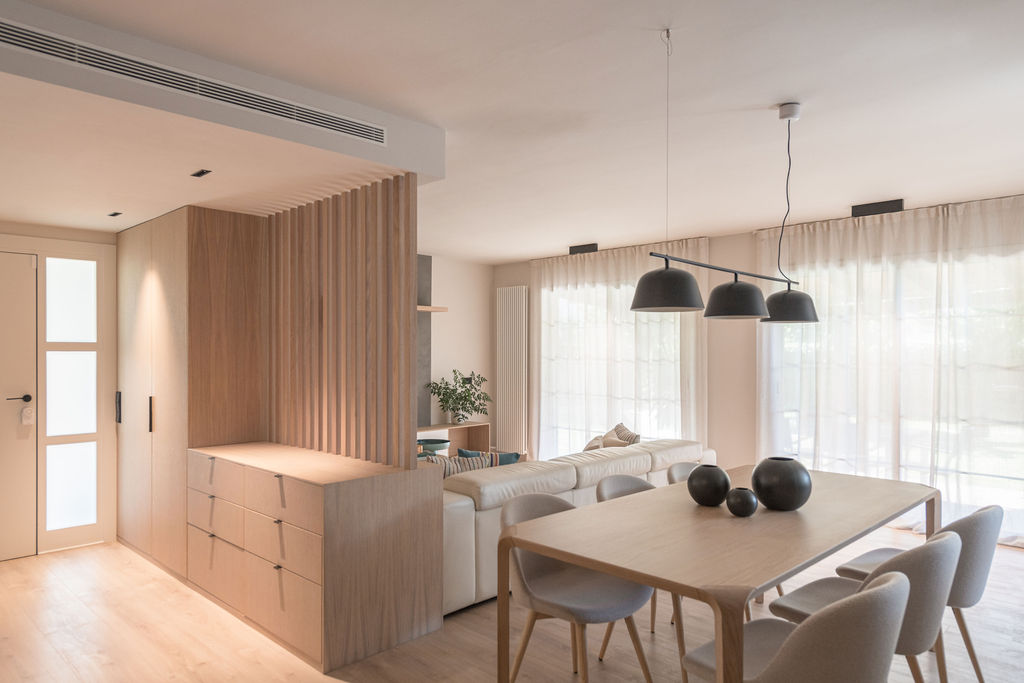 Dentro de ese mobiliario destaca un elemento separador entre el recibidor y el salón. Este elemento combina una parte opaca con armarios y otra parte que permite vislumbrar la zona del salón, añadiendo un toque de misterio y sofisticación. La mesa del comedor también se convirtió en el núcleo central de la zona de día, otorgando un ambiente íntimo y acogedor a la zona del salón.