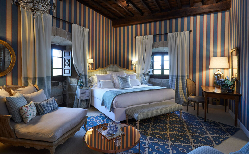 Inspirada en la intensa vida diplomática de la virreina y su personalidad sensible y educada, esta habitación ubicada en la primera planta ha sido decorada con una selección de piezas de origen francés, desde sus tapicerías de estampados de Vichy de tonos azules y blancos hasta sus lavabos de hierro fundido estampados en blanco y con motivos de toile de jouy.
