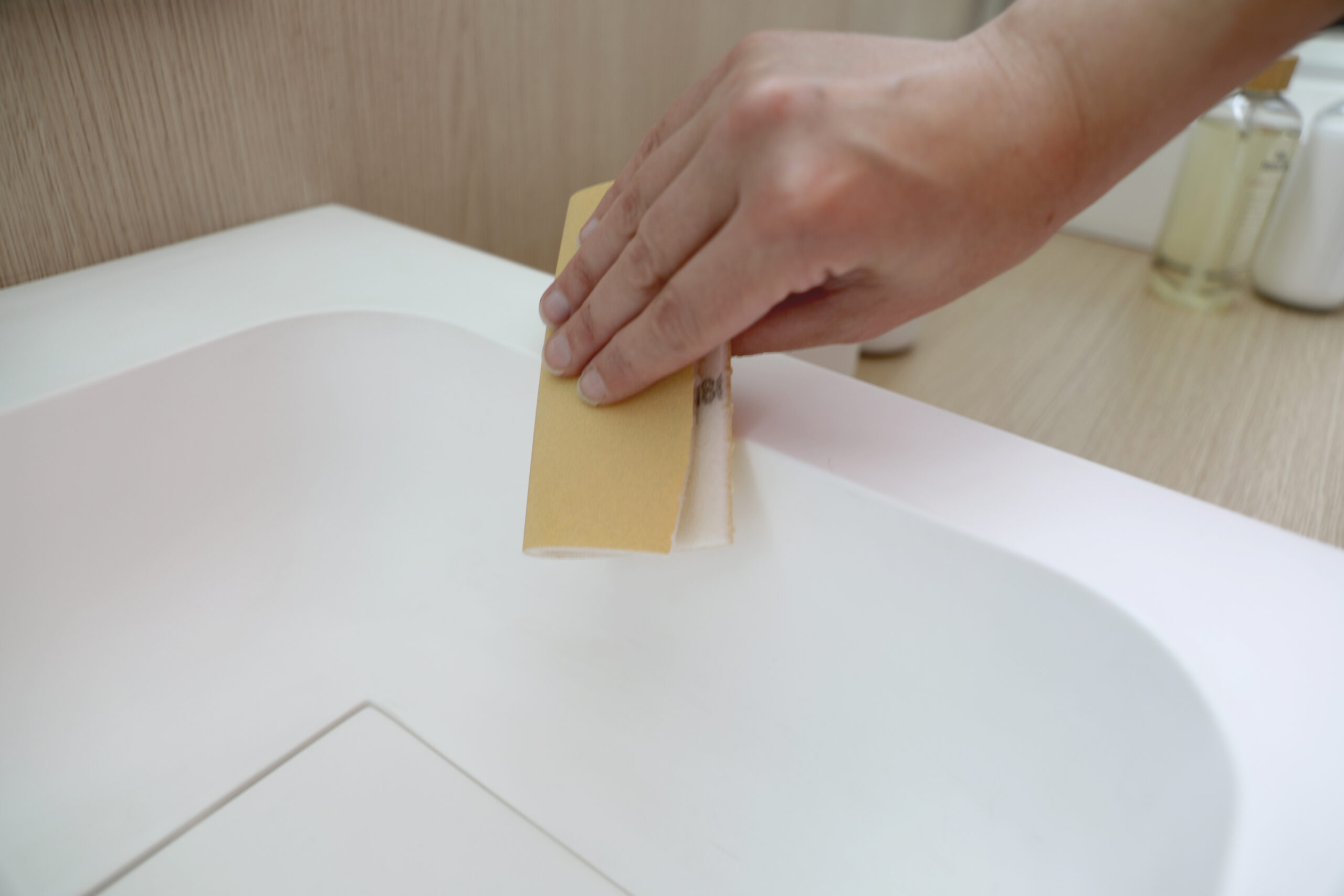 SOLID SURFACE. Ante una mancha persistente sobre este material, utiliza un papel de lija suave para profundizar un poco en la superficie. Para ello, limpia previamente la pieza, humedécela ligeramente y procede al lijado mientras aún esté húmeda.