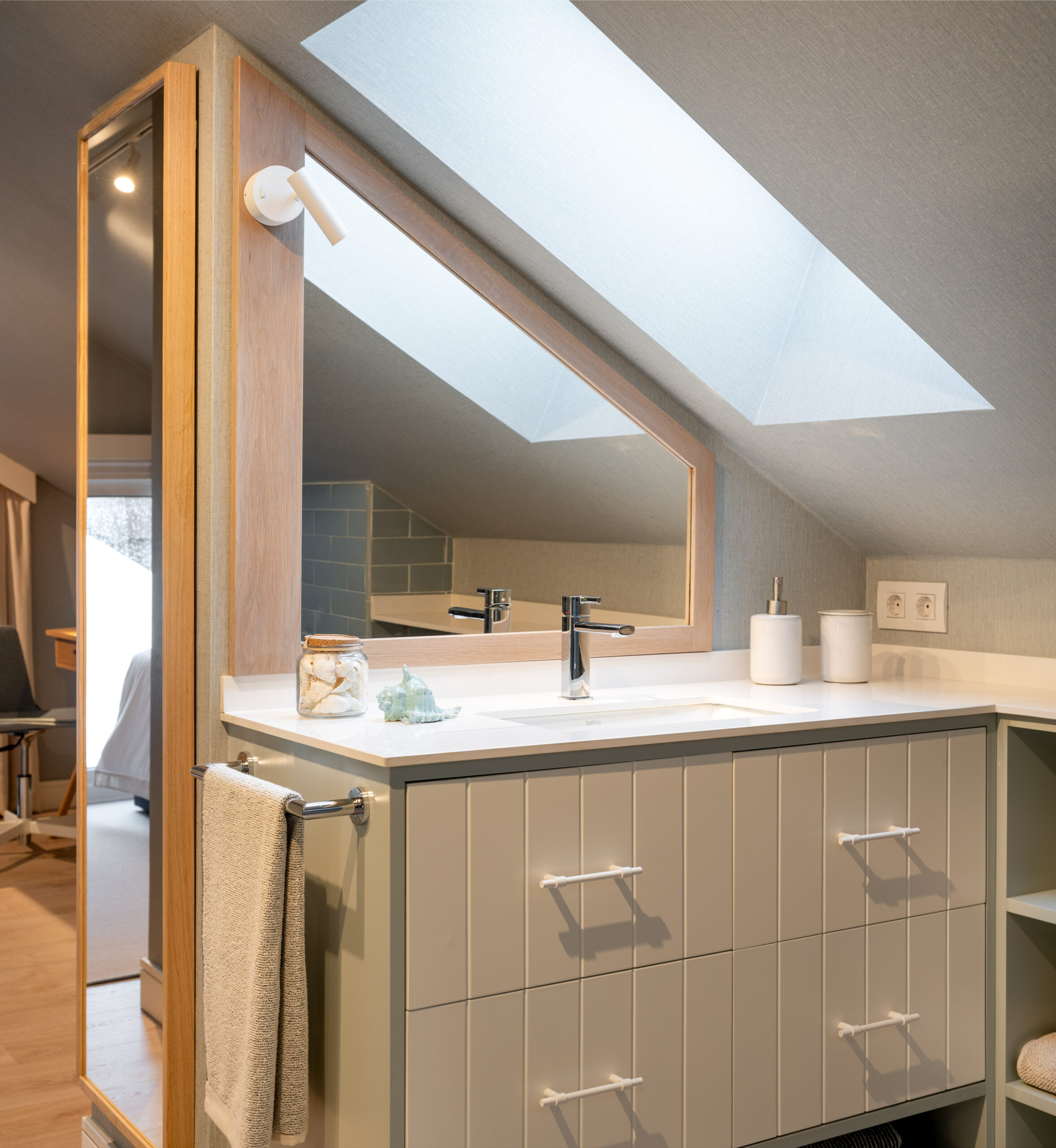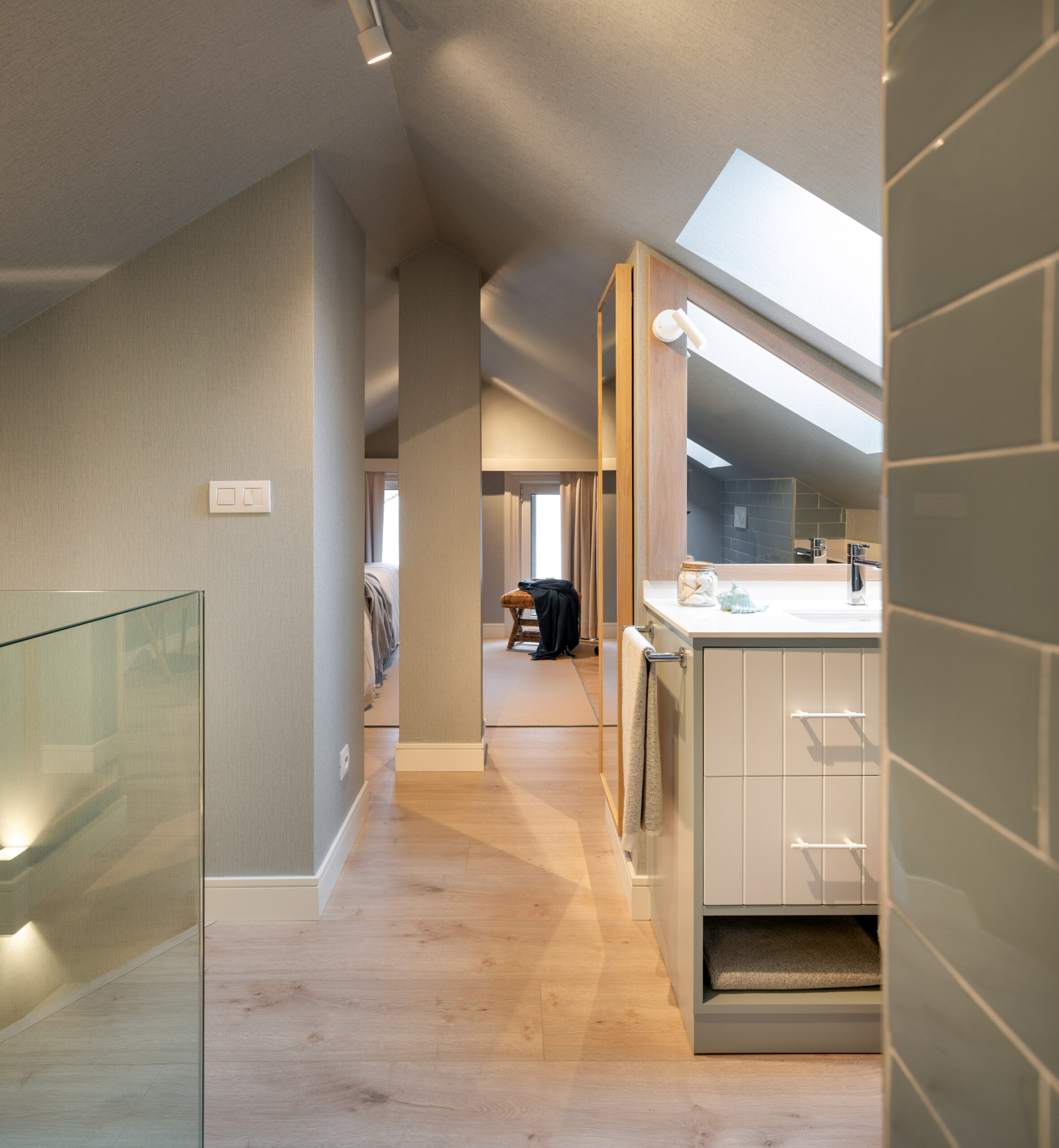 La suite principal, con vistas privilegiadas a la playa de Getxo, tiene un vestidor inundado de luz natural y un lujoso baño con doble lavabo de bajoencastre Torino, este espacio está impregnado de tonos suaves como el blanco y el beige.