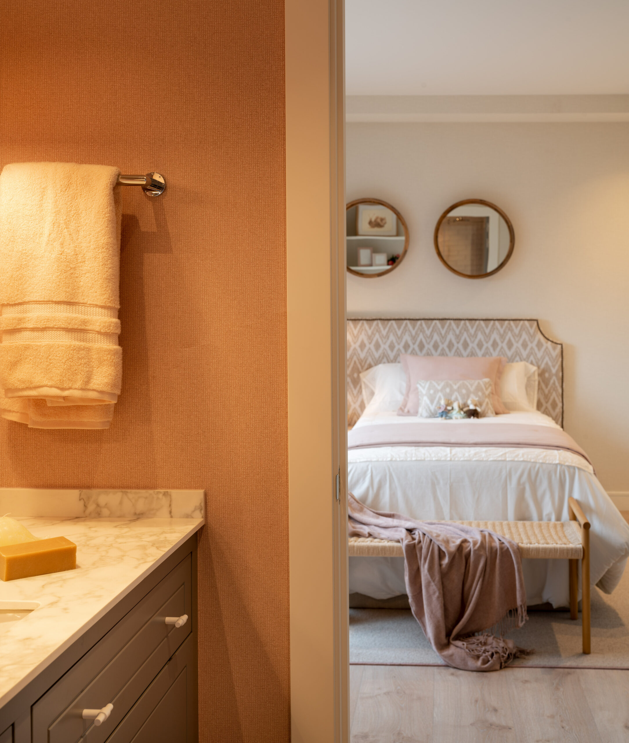 La habitación de la hija pequeña está decorada con papel pintado rosa y un cabecero tapizado. La habitación lleva una zona de estudio, unos amplios armarios, y un cuarto de baño con papel pintado también rosa. Mientras que el dormitorio del hijo, con tonalidades azules es un refugio semi-independiente equipado con su propio baño y una zona de estudio, creando el escenario perfecto. En ambos casos, los baños están equipados con lavabos Torino de Bathco que complementan la estética general del espacio, brindando funcionalidad y estilo.