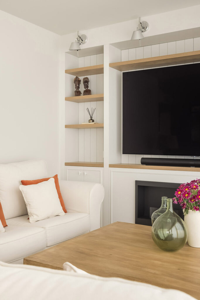 Uno de los puntos fuertes del proyecto es el uso de materiales naturales en los acabados y el mobiliario. La madera, presente en las encimeras, estanterías y revestimientos, aporta un toque cálido y conecta el interior de la vivienda con la estética del paisaje alicantino. Este enfoque en materiales naturales no solo resalta la belleza del espacio, sino que también asegura su durabilidad y funcionalidad.