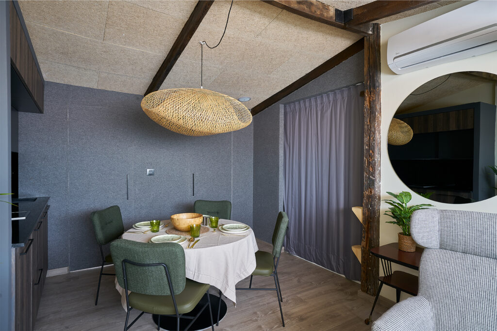 Tras la mesa del comedor se intuyen dos puertas disimuladas ya que están forradas igual que la propia pared. Estas dan acceso al dormitorio y al baño.