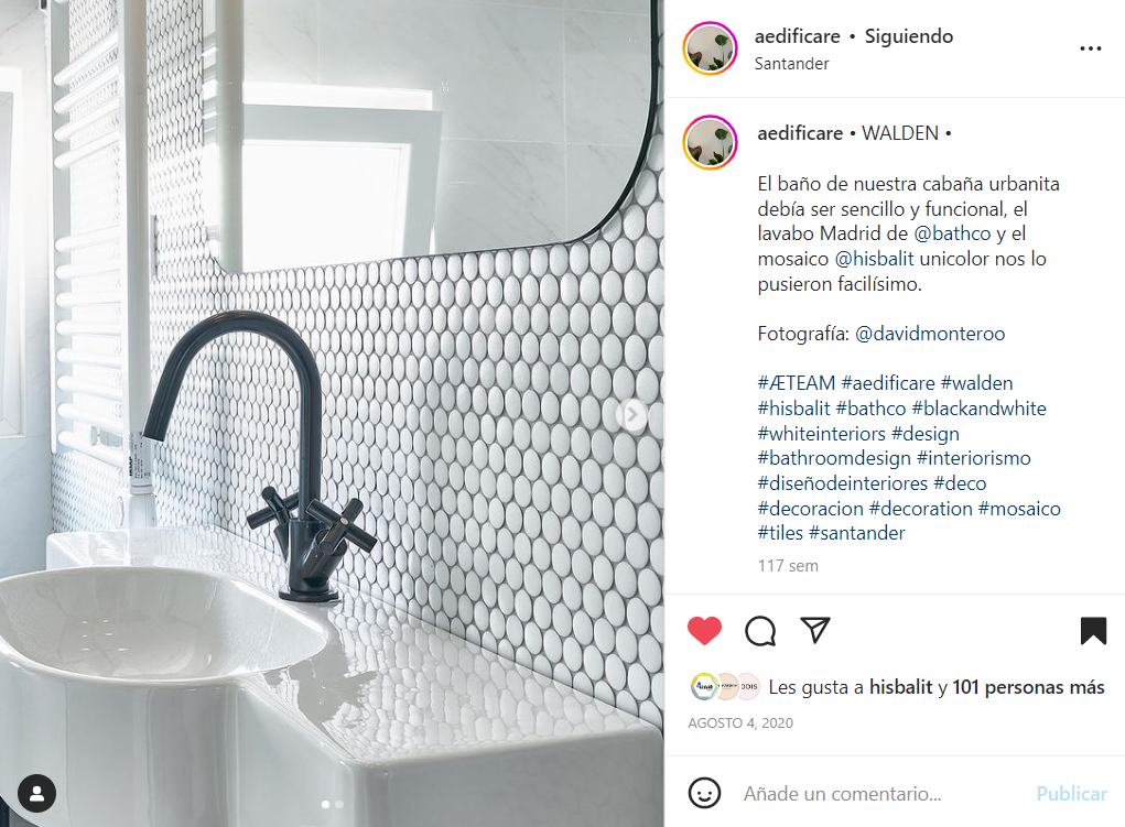 Desde Aedificare comentan que «el baño de nuestra cabaña urbanita debía ser sencillo y funcional, el lavabo Madrid de @bathco y el mosaico @hisbalit unicolor nos lo pusieron facilísimo».