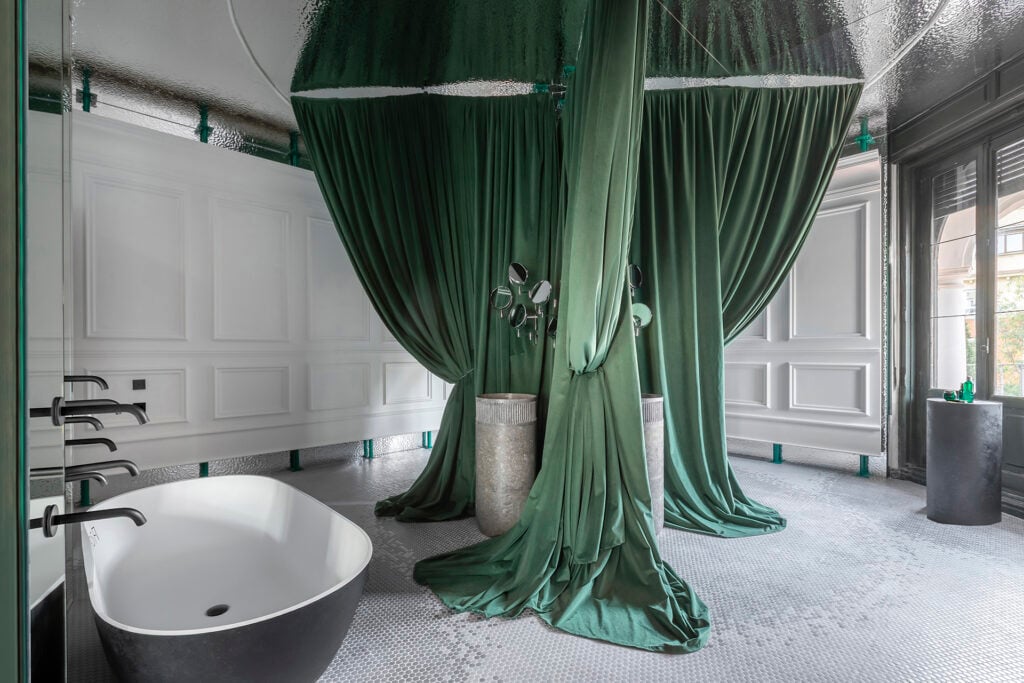 El diseño teatral de Alfaro-Manrique Atelier transforma el espacio en una metáfora cinematográfica de Fellini, donde la Fontana de Trevi queda representada por la bañera, los lavabos y los espejos, mientras que las cortinas evocan el vestido de la protagonista en la secuencia de la Dolce Vita, invitando a los visitantes a sumergirse en un mundo de cuidado y contemplación.