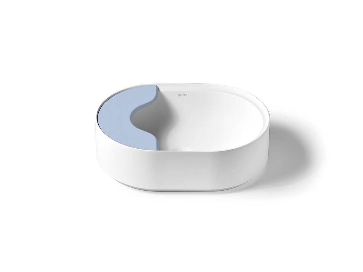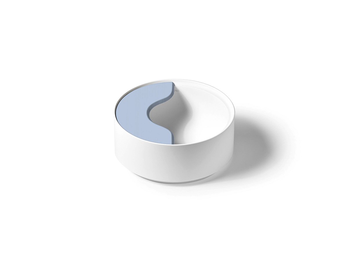 Esta bandeja circular es un accesorio, fabricado en bambú, fabricado en bambú en color azul para colocar como complemento al lavabo Seceda circular y oval.