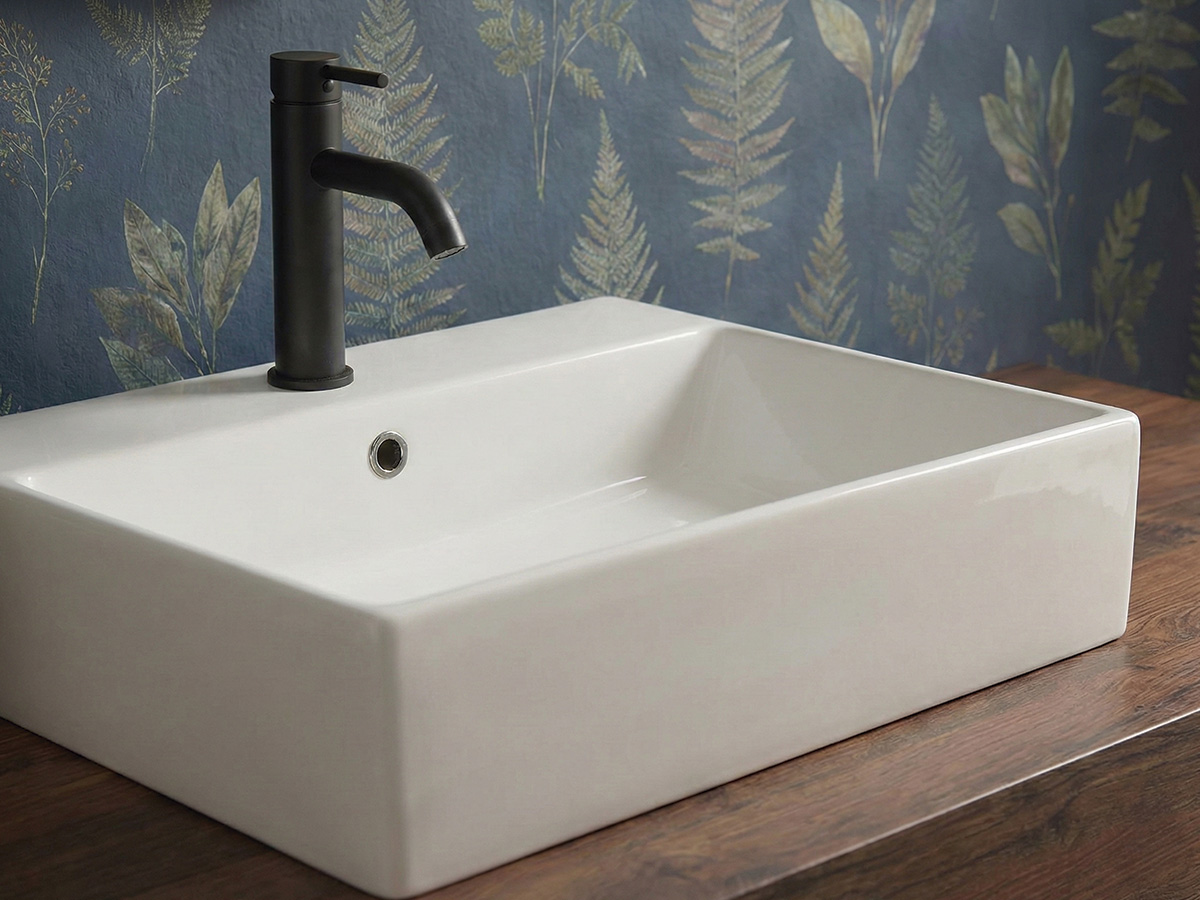 Equilibrio entre formato y proporción en un diseño rectangular de porcelana brillo. Instalación sobre encimera o suspendida para una integración versátil.