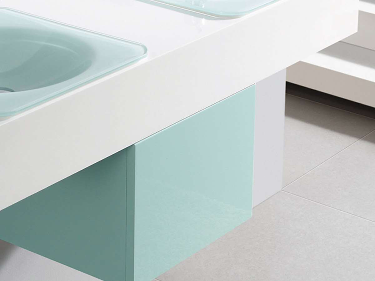 Un módulo compacto en madera con frente en color. Más capacidad en un formato de líneas sencillas. Sistema Push to Open y líneas depuradas que aportan practicidad y un acento fresco al baño.