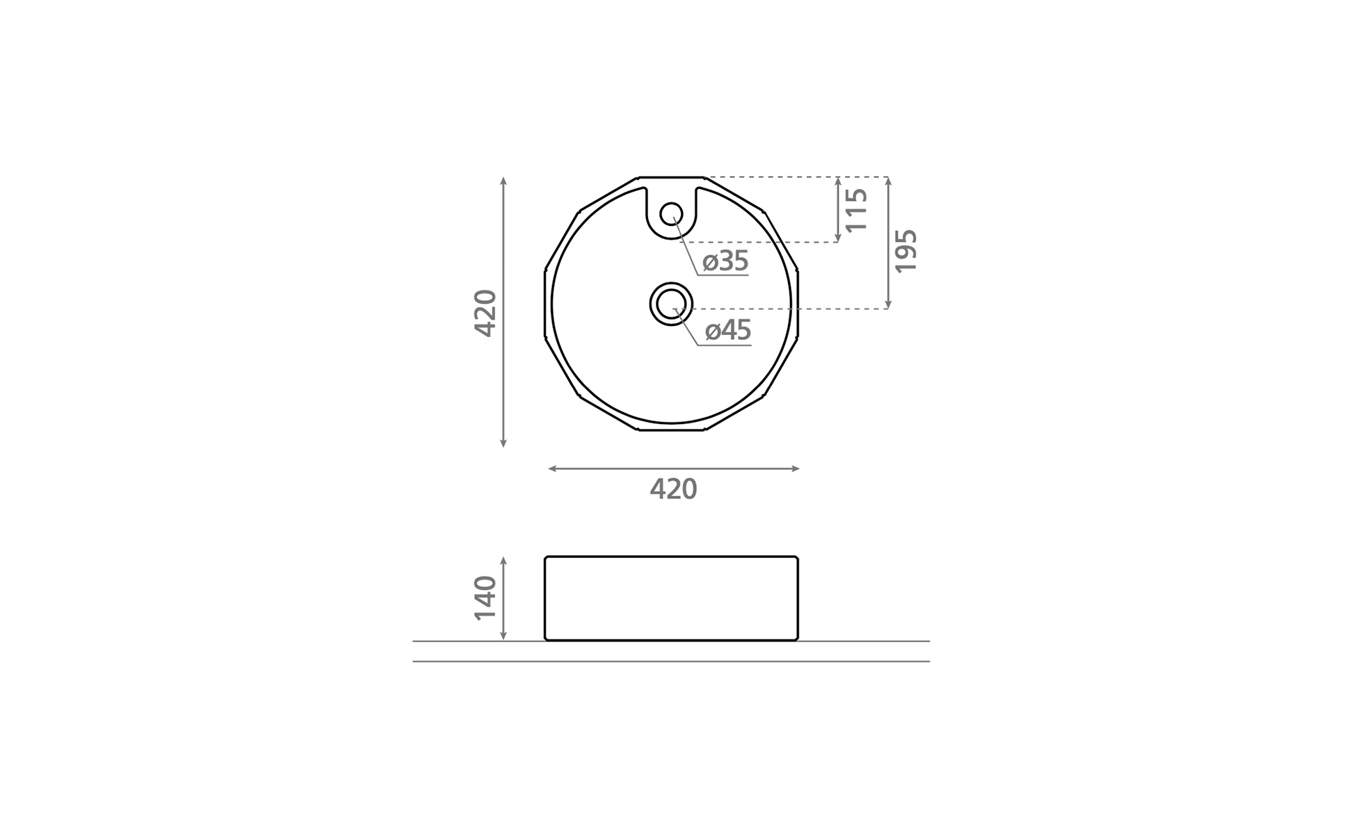 La lectura más luminosa del modelo. Porcelana brillo en formato circular de sobre encimera, con una estética esencial y vigente.