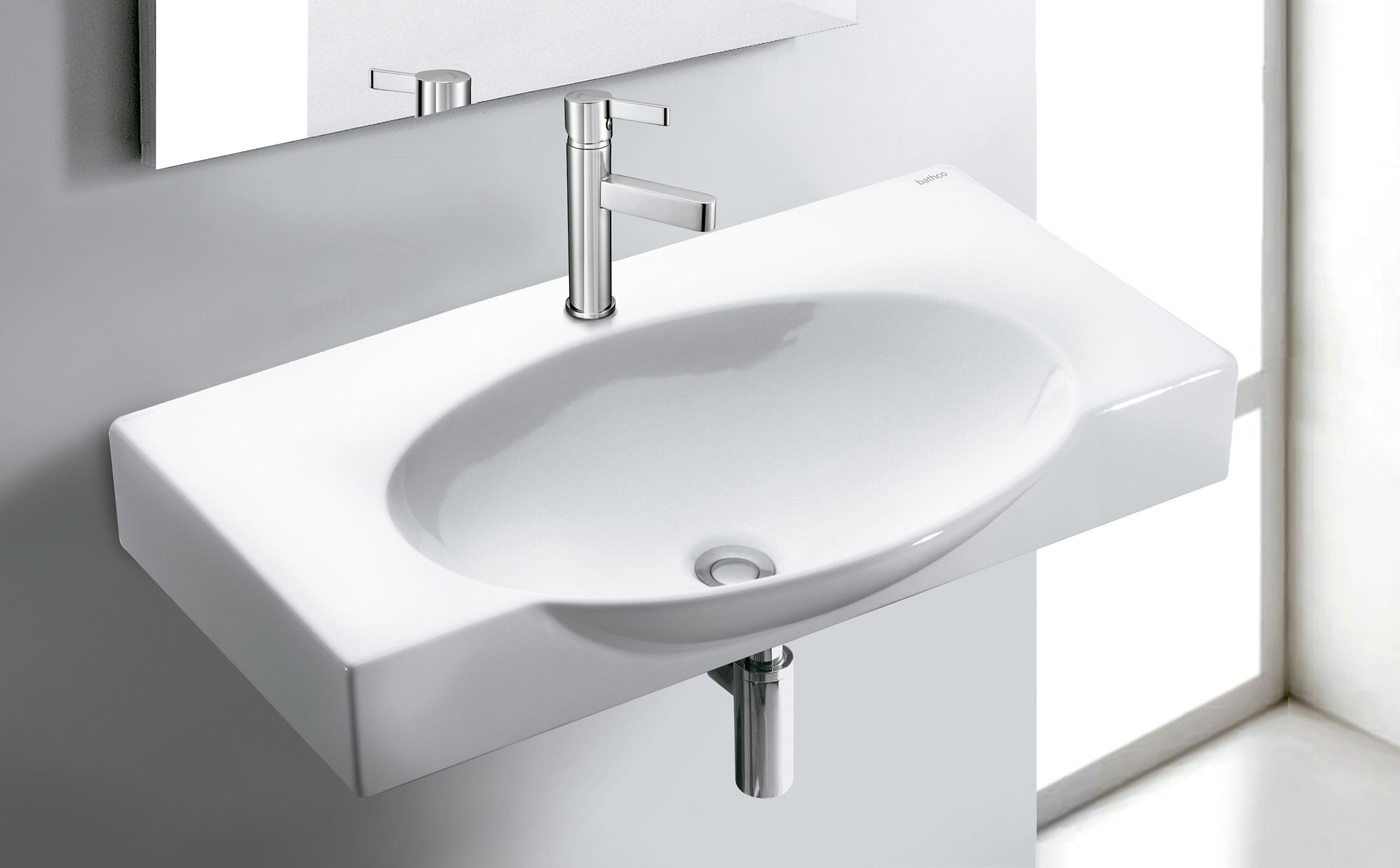Lavabo rectangular suspendido en porcelana brillo. Un diseño despejado y contemporáneo que libera superficie y aligera el espacio.