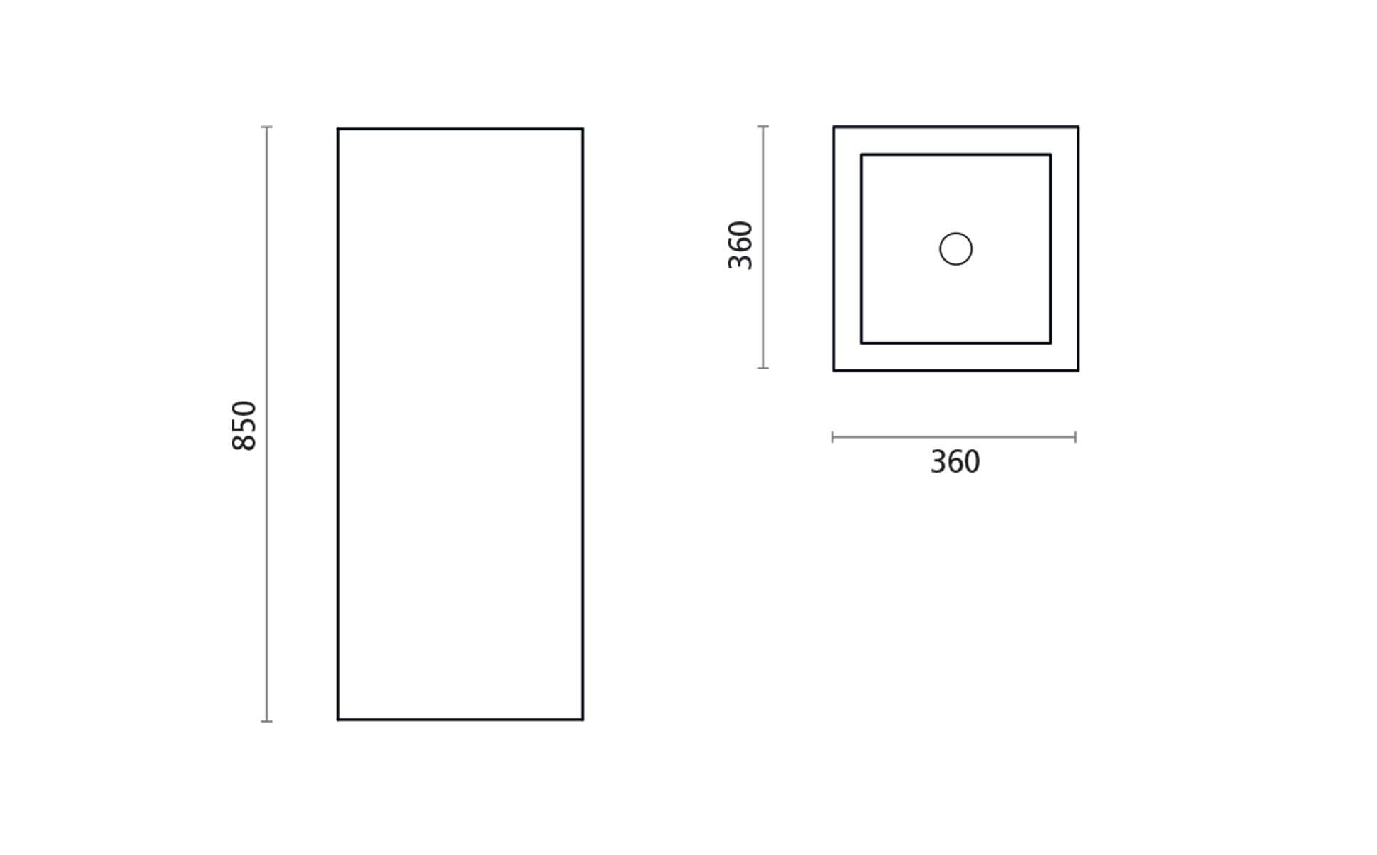 Volumen cúbico en solid surface para una presencia escultórica. Un pedestal de líneas puras y tacto sedoso que ordena el conjunto.