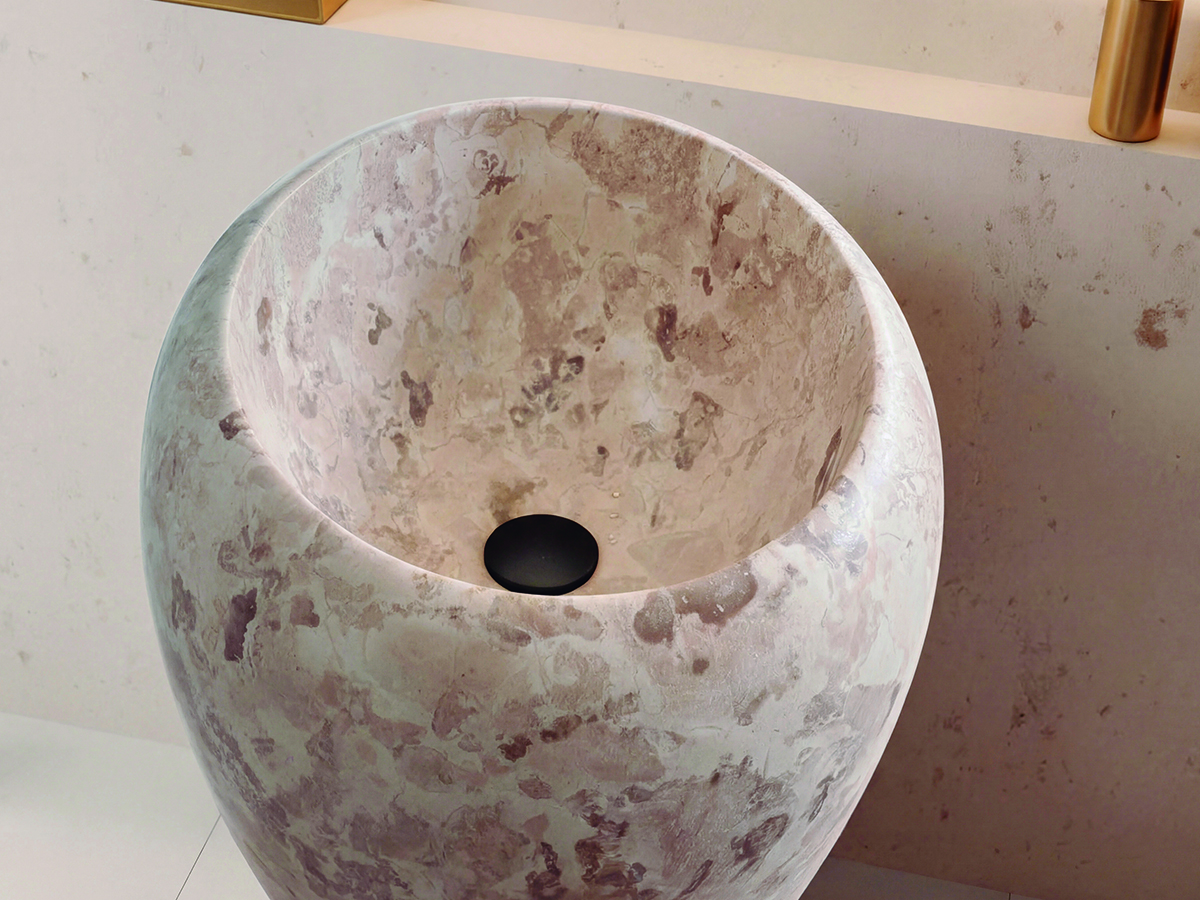 Fuji Brown Trotol es un lavabo circular de instalación pedestal, fabricado en piedra con acabado relieve en color brown trotol