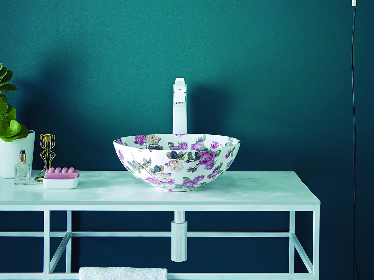 Una serie de lavabos circulares en porcelana decorada, disponibles en múltiples acabados artísticos. Cada pieza está diseñada para sobre encimera, con versiones en porcelana blanca o natural, convirtiéndose en elementos expresivos y llenos de carácter.