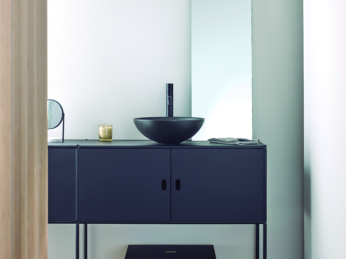 Lavabo circular en porcelana, disponible en blanco brillo, blanco mate, negro mate o porcelana natural. De sobre encimera, se convierte en un básico versátil.
