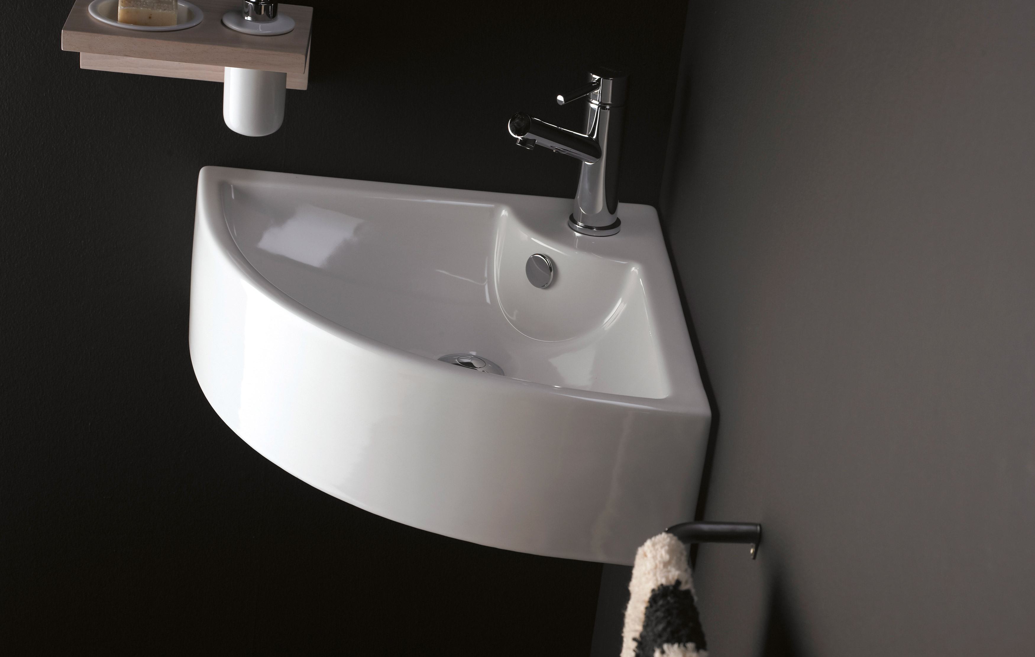 Lavabo esquinero en porcelana blanca, diseñado para optimizar el espacio sin renunciar a la estética. Su formato suspendido lo convierte en una solución práctica y elegante.