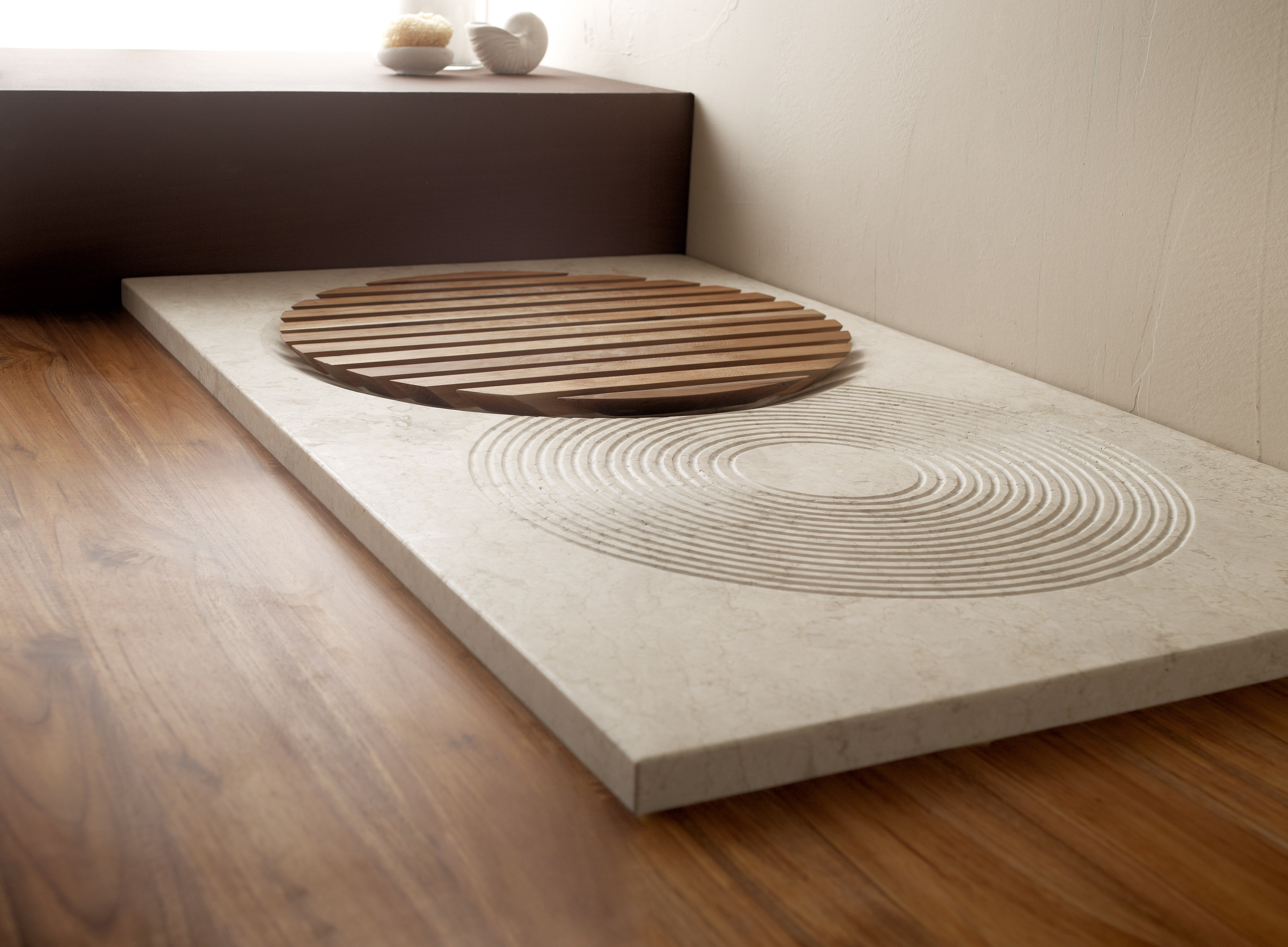 Plato de ducha en piedra natural beige, perteneciente a la colección Natural Series. Robustez y calidez en una pieza de gran presencia.