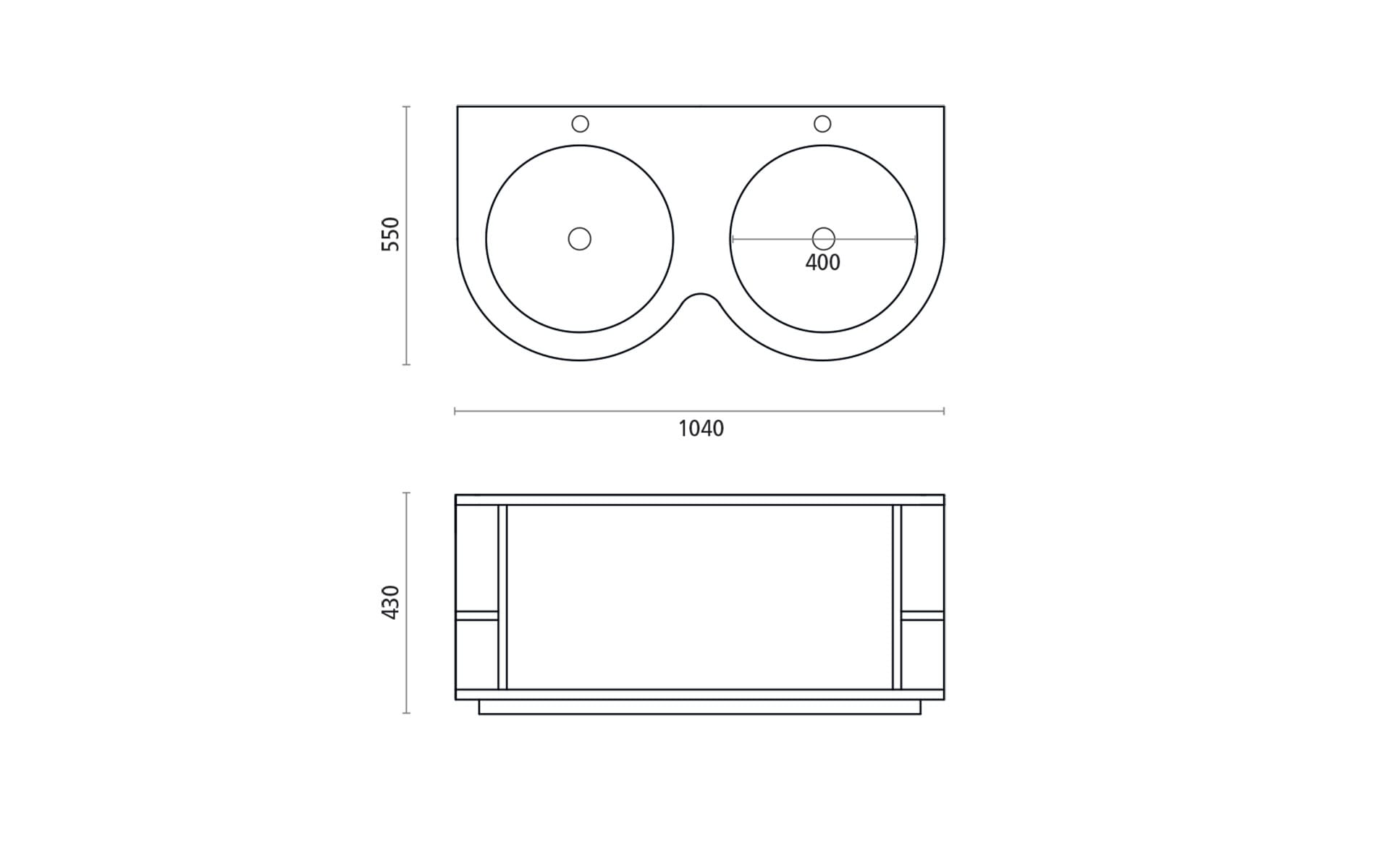 Composición que integra mueble de roble y lavabo doble en solid surface. Disponible en acabado gris o natural, también disponible con una sola poza.