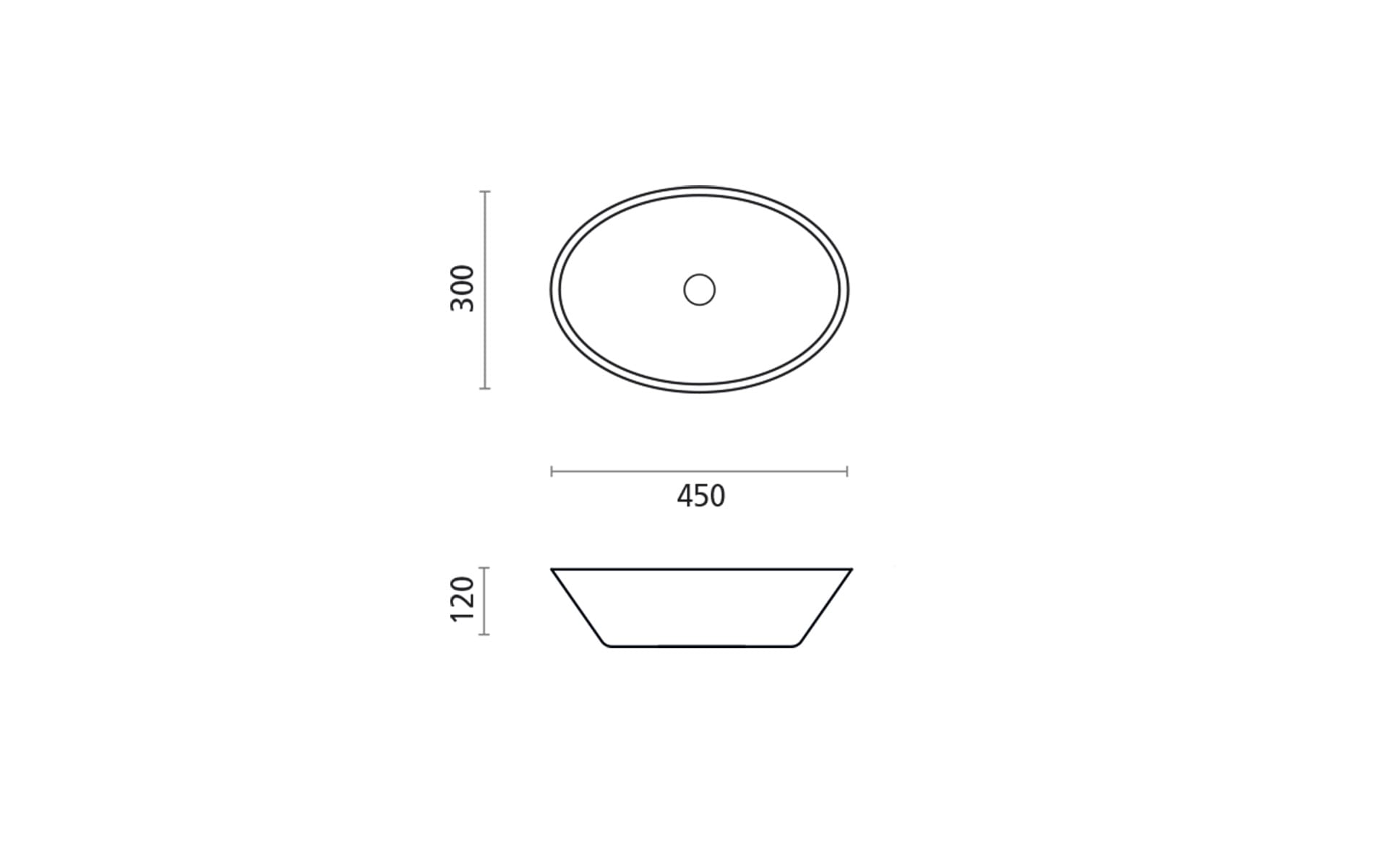 Lavabo oval de Solid Surface para sobre encimera. Disponible en diferentes acabados, destaca por su diseño fino y su resistencia, pensado para un uso prolongado.