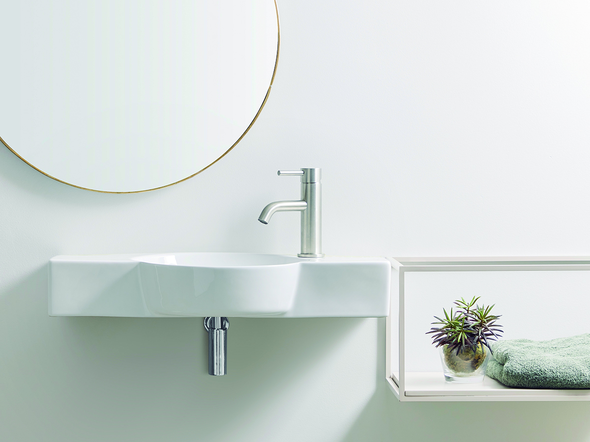 Lavabo mini de porcelana blanca. Compacto y funcional, se adapta tanto a instalación suspendida como sobre encimera, ideal para espacios reducidos.