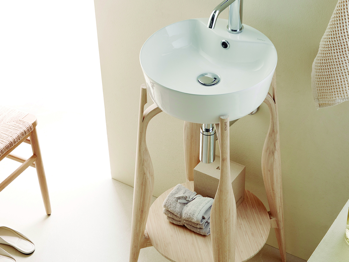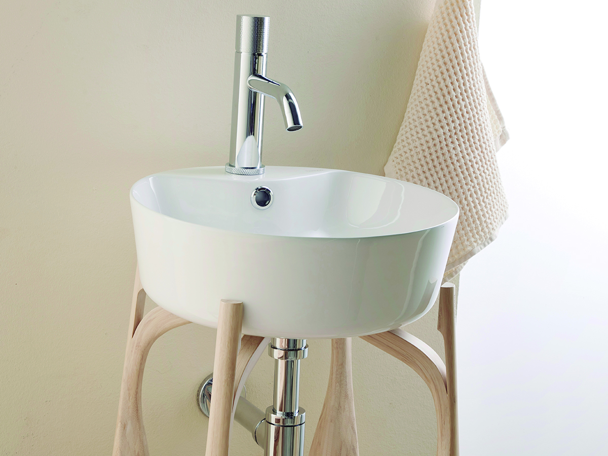 Lavabo circular de porcelana blanca. Su formato compacto y atemporal encaja con facilidad en distintos estilos de baño.